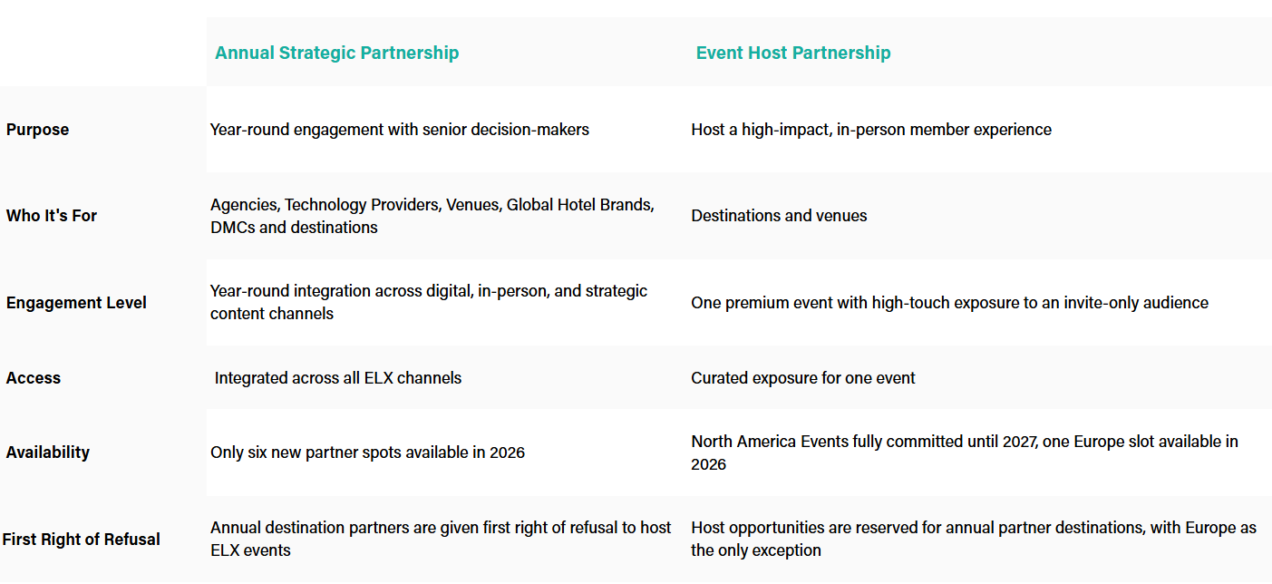 ELX is not an industry association or a sponsorship platform. It is an invitation-only partnership for companies that bring strategic value, contribute insight, and enhance the experience for the most senior corporate event leaders in the world. By the end of 2026, the community is projected to include 400 senior leaders overseeing more than 240,000 events.